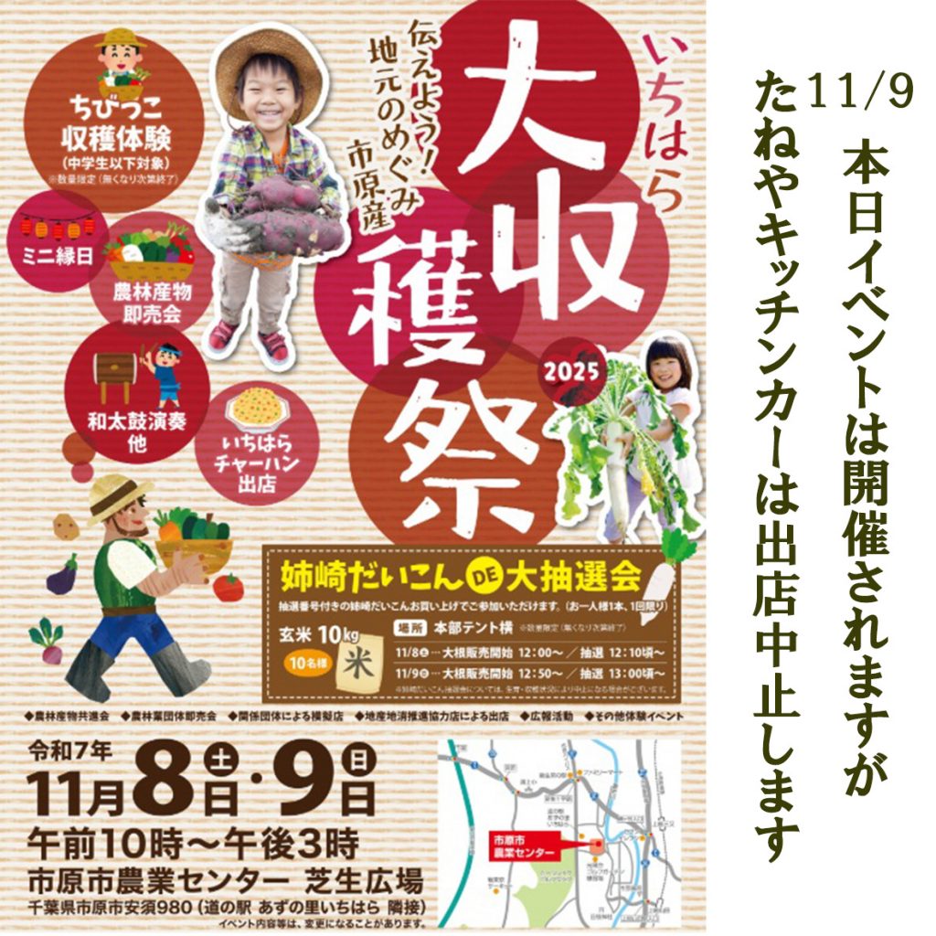 11/9(日)本日もいちはら大収穫祭は開催されますが、たねやキッチンカーは出店を中止いたします。